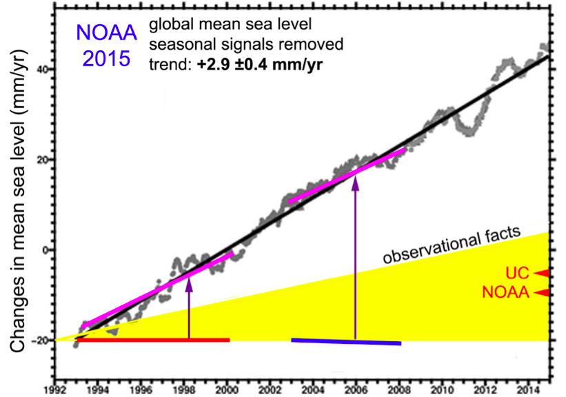 The rising oblique cure of 2.9 ±0.4 mm/yr gives the satellite altimetry record of NOAA in 2015. The yellow field marks the field of observational facts. Both the original satellite altimetry record (red line) and the gravity record (blue line) were subjectively lifted up to cope with the rising trend of the NOAA record: this implies a serious “manipulation”.