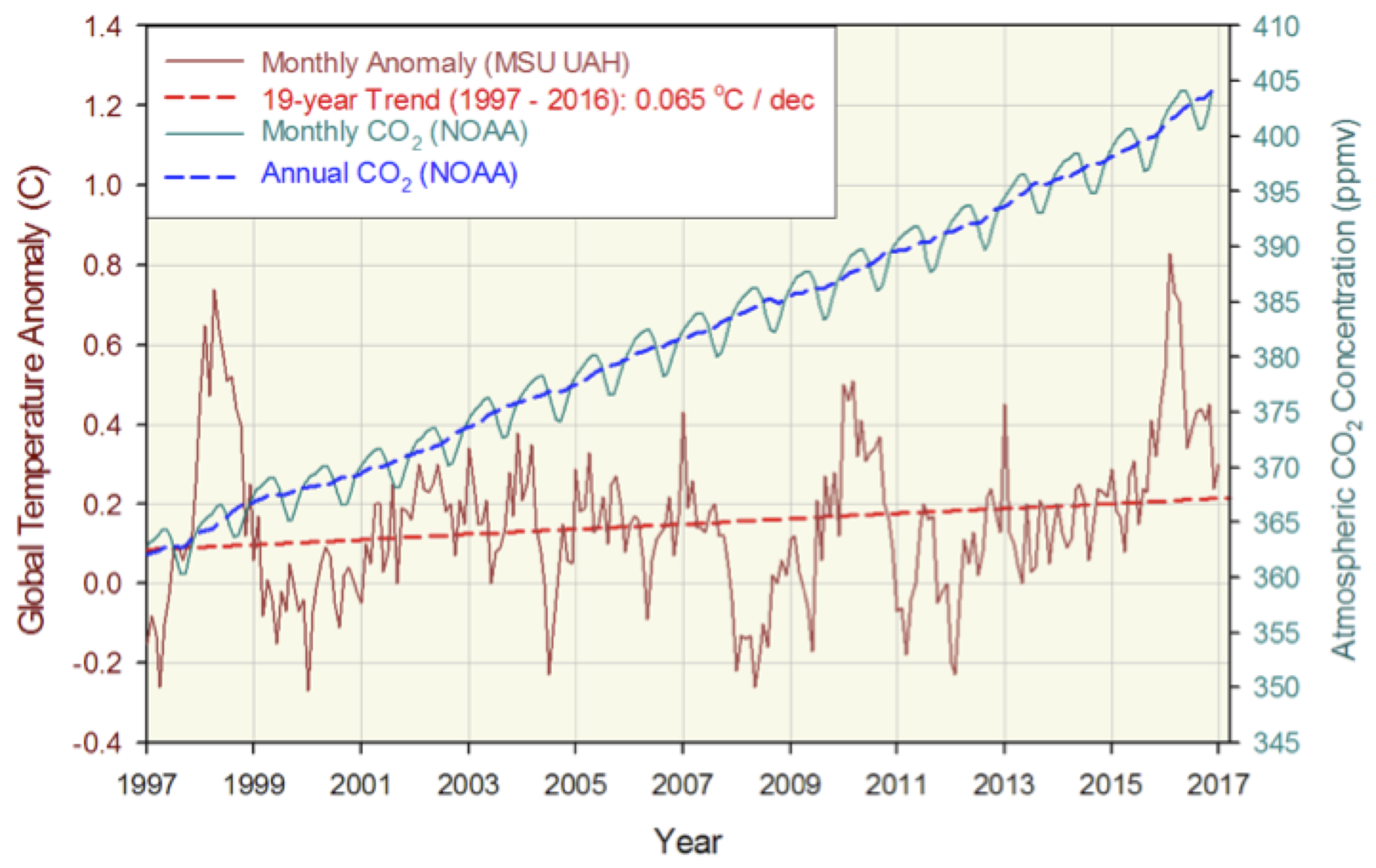 2. Om man ser till förhållandet hur CO2 halten i atmosfären kontinuerligt ökat under des sista 19 åren men hur jordens temperatur samtidigt knappast ökat nämnvärt (bara med 0.065 °C per årtionde), så borde det stå klart att CO2 halten har ingen eller närmast negligerbar effekt på jordens klimat.