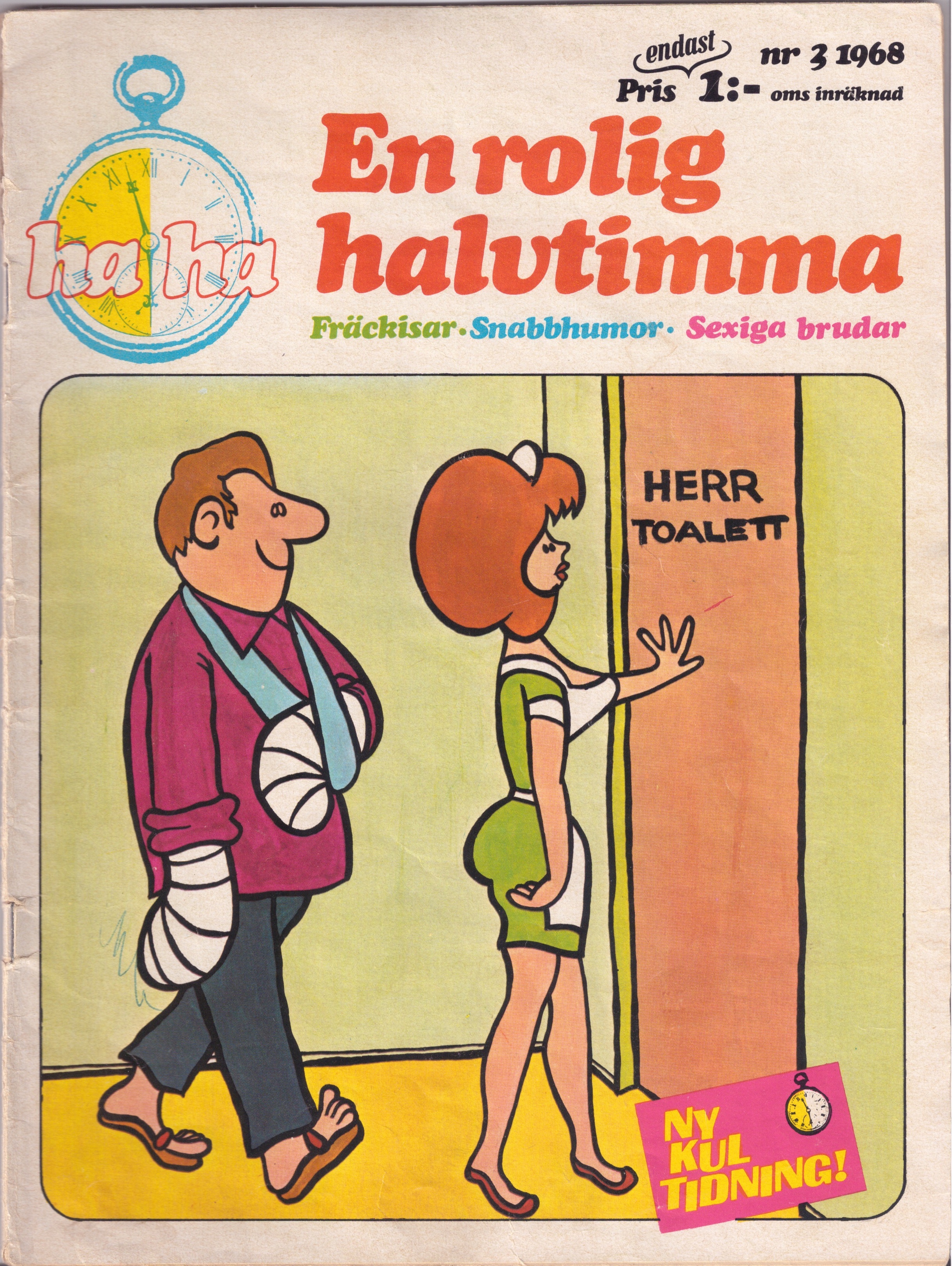 Jag har i min ägo några nummer av den tecknade tidningen En Rolig Halvtimme. Har tydligen följt med i ett antal flyttar och nu åter kommit fram när vi ämnar flytta igen. Den äldsta är från tidningens första år, 1968, nr 3 närmare bestämt. Återger dess framsida längre ner, tillsammans med några exempel på hur det kunde se ut inuti tidningen.